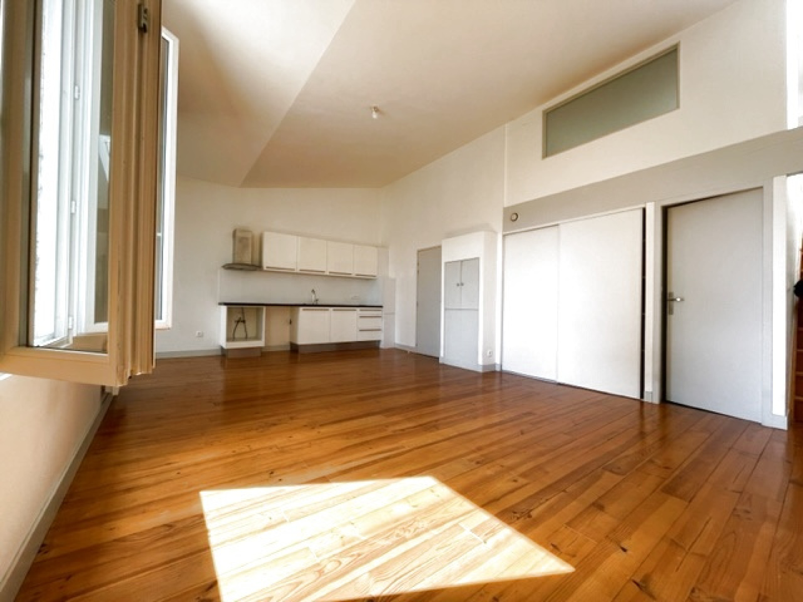 Composé d'un vaste séjour très lumineux ouvert sur la cuisine équipée, d'un coin bureau, d'une grande salle d'eau avec WC.